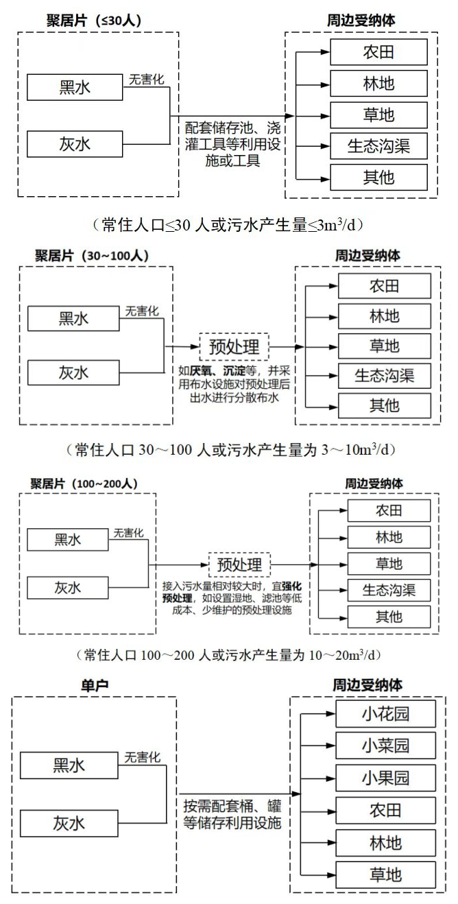 3、以村莊常住人口數(shù)、污水產(chǎn)生量將資源化利用分為零散戶和聚居片2類4種情況,細化了污水資源化利用各環(huán)節(jié)的要求。