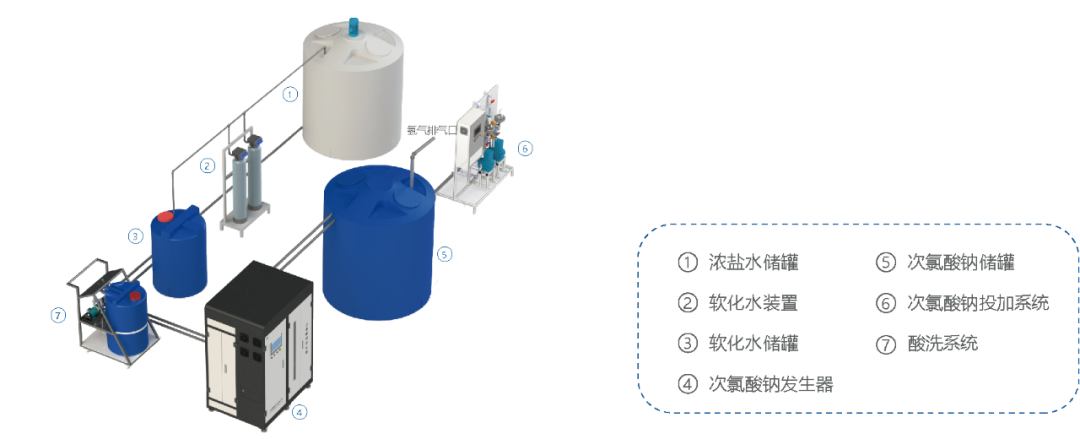 電解次氯酸鈉發(fā)生器由次氯酸鈉發(fā)生器本體、軟化水系統(tǒng)(含再生裝置)、溶鹽系統(tǒng)、稀鹽水配制系統(tǒng)、次氯酸鈉電解發(fā)生系統(tǒng)、冷卻系統(tǒng)、次氯酸鈉儲(chǔ)存及投加系統(tǒng)、即時(shí)排氫系統(tǒng)、自動(dòng)控制系統(tǒng)九部分組成,可根據(jù)用戶要求適當(dāng)增減設(shè)備配置。