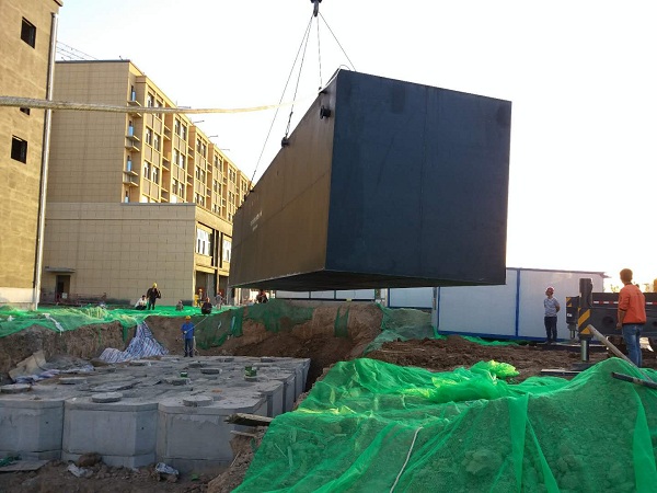 2、安裝:根據安裝圖就位,各箱體依次就位,箱體的位置、方向不能放錯,互相間距必須準確,并連接好管道。在設備內注入清水,檢查各管道有無滲漏,若無則箱體四周覆土,直至設備檢查孔,并平整地面。把電控箱控制線與水